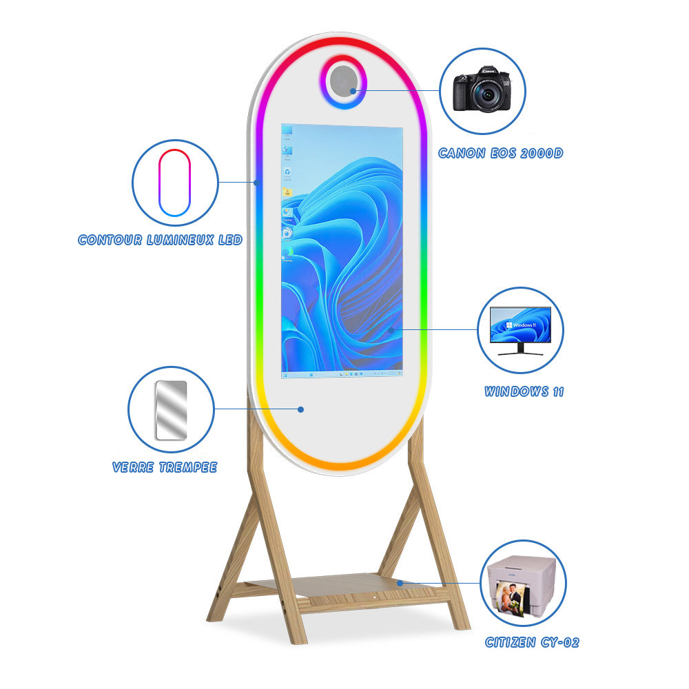 Alliant élégance intemporelle et légèreté remarquable, notre miroir Elégance en bois s’intègre parfaitement dans les lieux les plus raffinés. Son design épuré et chaleureux apporte une touche chic à vos événements, tandis que sa conception légère facilite le transport et l’installation. Une solution idéale pour offrir une expérience photo haut de gamme, sans compromis sur la praticité.